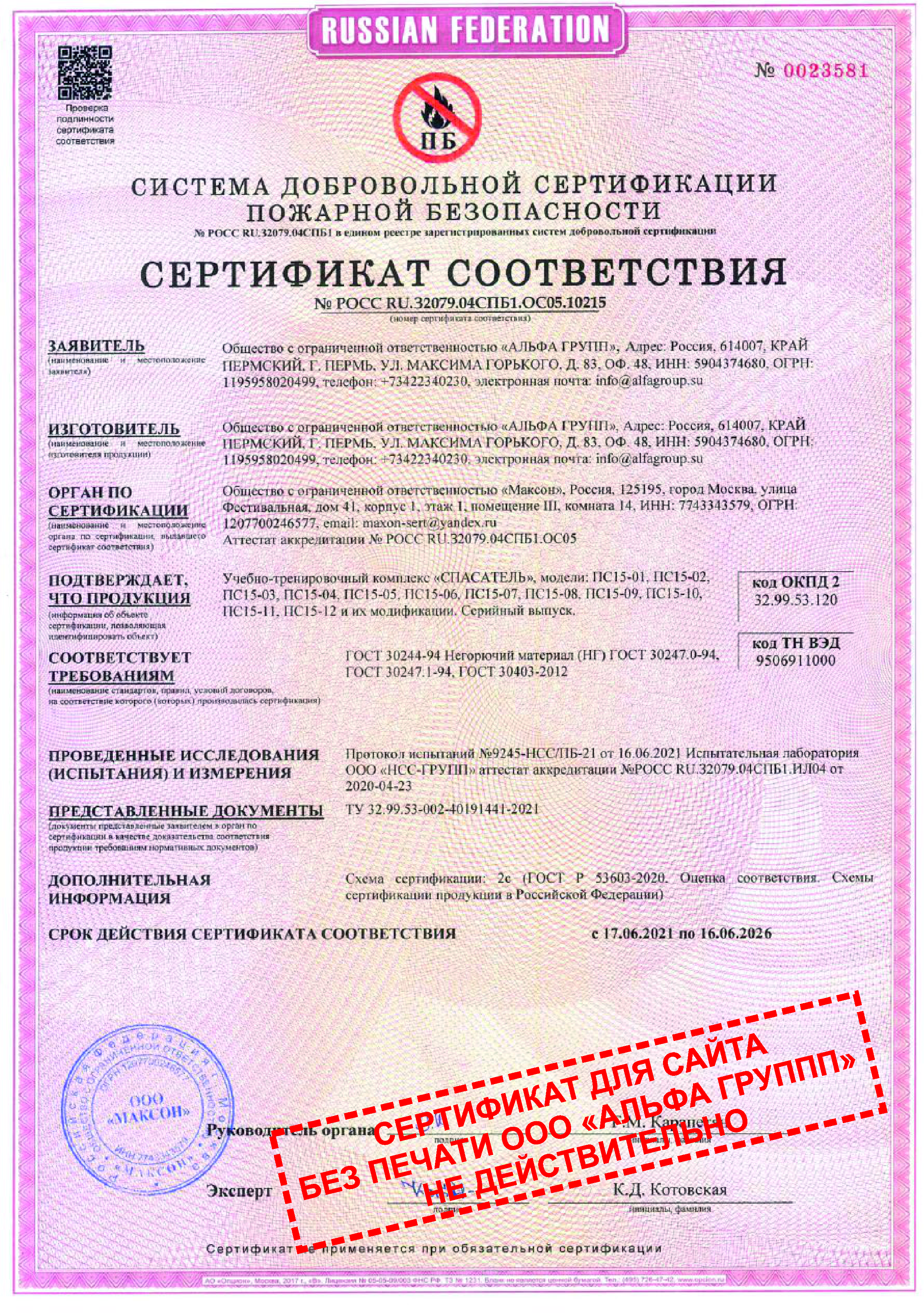 • Учебные комплексы «СПАСАТЕЛЬ» сертифицированы и изготавливаются по Техническим условиям ООО «АЛЬФА ГРУПП» Полигон учебно-тренировочный ТУ 32.99.53-002-40191441-2021.